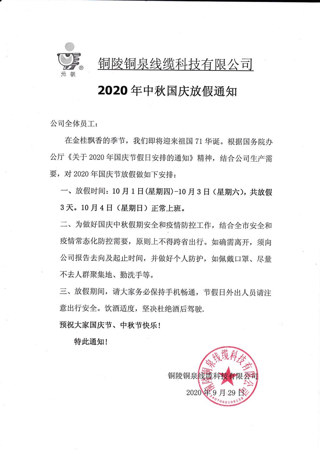 2020年國慶節(jié)放假通知